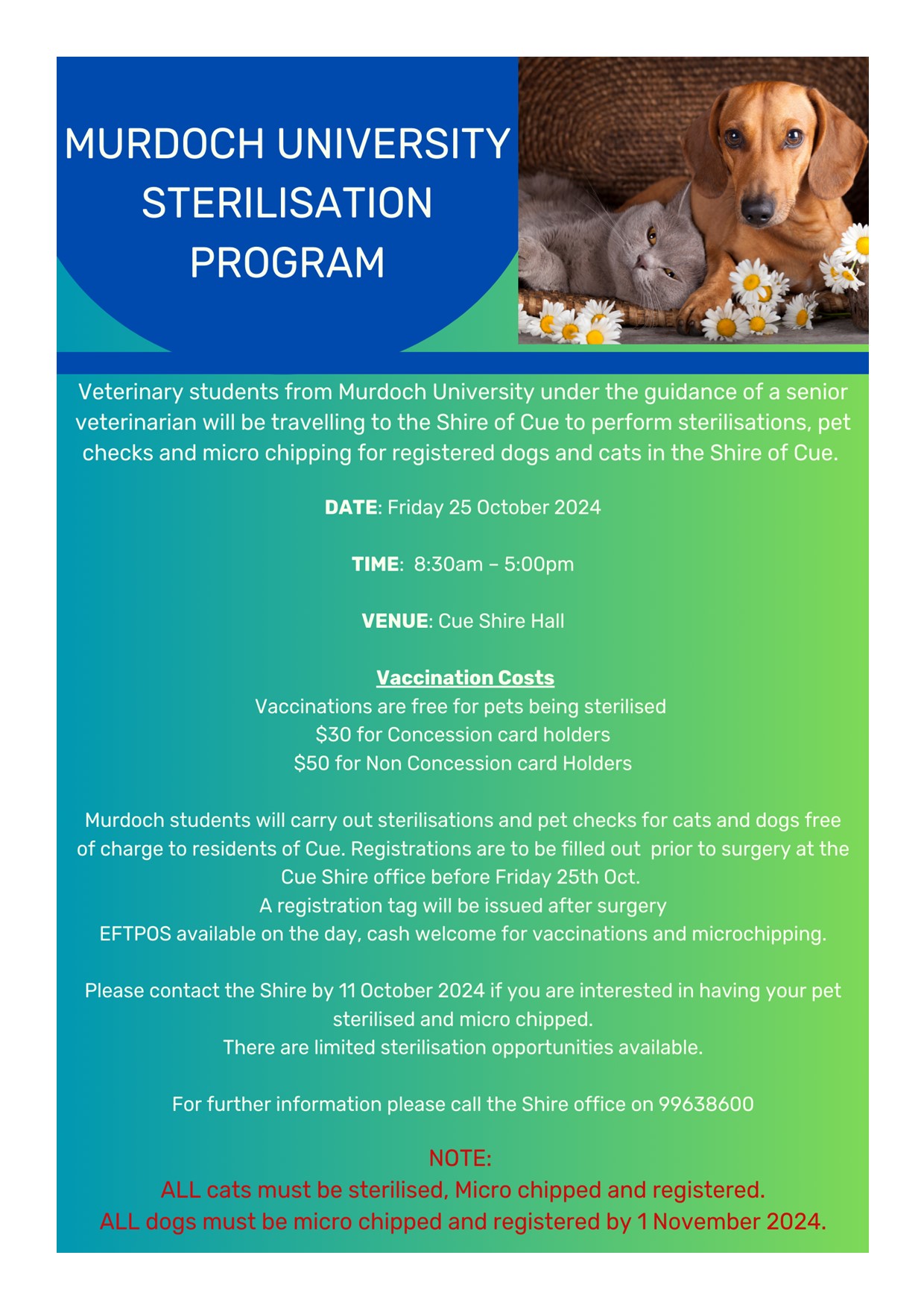 « All Events This event has passed. Murdoch University Sterilisation Program 25 October, 2024 @ 8:30 am - 5:00 pm « Name the Gym Competition Halloween » Add to calendar Google Calendar iCalendar Outlook 365 Outlook Live Details Date: 25 October, 2024 Time: 8:30 am - 5:00 pm